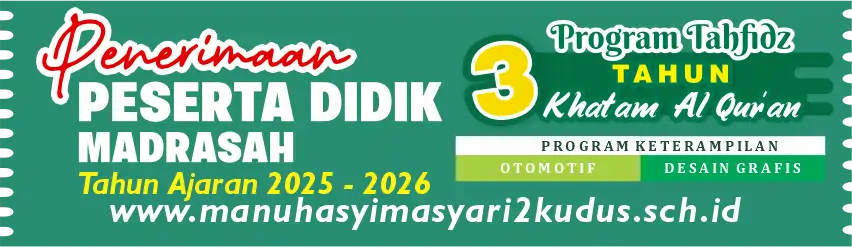 MA NU Hasyim Asy’ari 2 Kudus membuka Penerimaan Peserta Didik Baru Madrasah (PPDBM) untuk Tahun Pelajaran 2025/2026. Kami mengundang para lulusan SMP/MTs sederajat dan peserta didik dari madrasah/sekolah lain yang ingin melanjutkan pendidikan di lingkungan yang religius, unggul, dan berwawasan kebangsaan.
